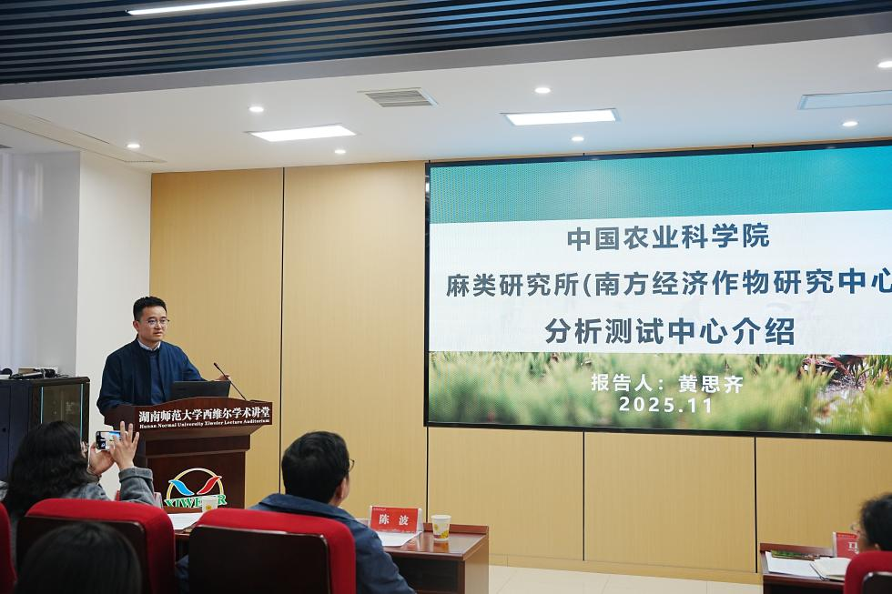 黄思齐首先通过一段视频,生动展示了麻类研究所的发展历程与研究特色。他强调,研究所始终秉持“把论文写在祖国大地上”的理念,注重科研成果落地转化。随后,他详细介绍了麻类分析检测中心的技术能力、检测成果及科研转化案例,并提出了具体的合作构想,希望与高校携手推动麻类产业的创新应用。