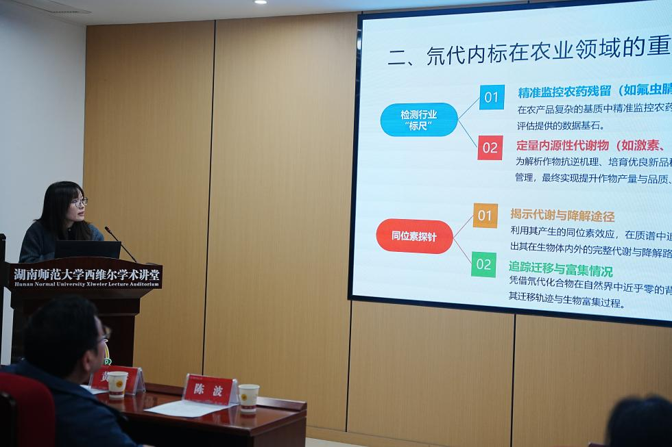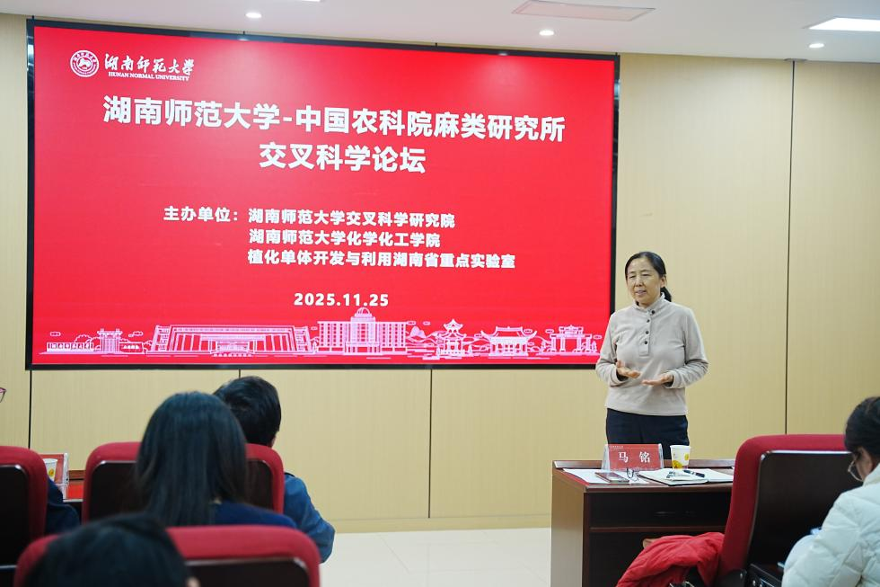 11月25日,我校“植化单体开发与利用”湖南省重点实验室、交叉科学研究院与中国农业科学院麻类研究所联合举办交叉科学论坛(以下简称“论坛”),论坛在化学化工学院西维尔学术讲堂举行。出席本次论坛的嘉宾包括:中国农业科学院麻类研究所分析检测中心主要负责人黄思齐、副主任刘亮亮、高级实验师廖丽萍和助理研究员刘源,我校交叉科学研究院副院长艾建平,重点实验室主任陈波教授,以及实验室学术骨干和研究生等。论坛由实验室马元鸿教授、郭宾教授和中国农科院麻类研究所廖丽萍高级实验师分段主持。